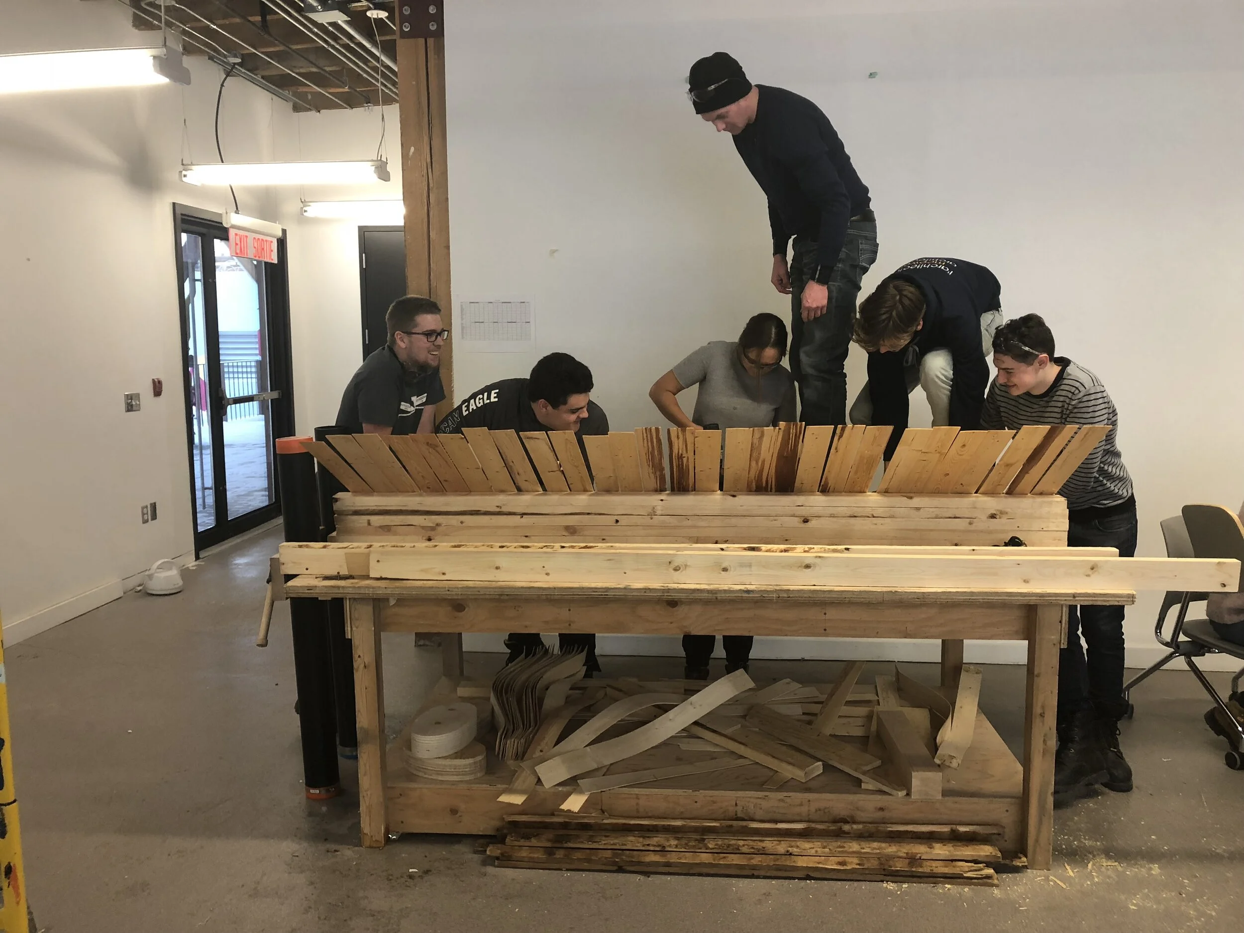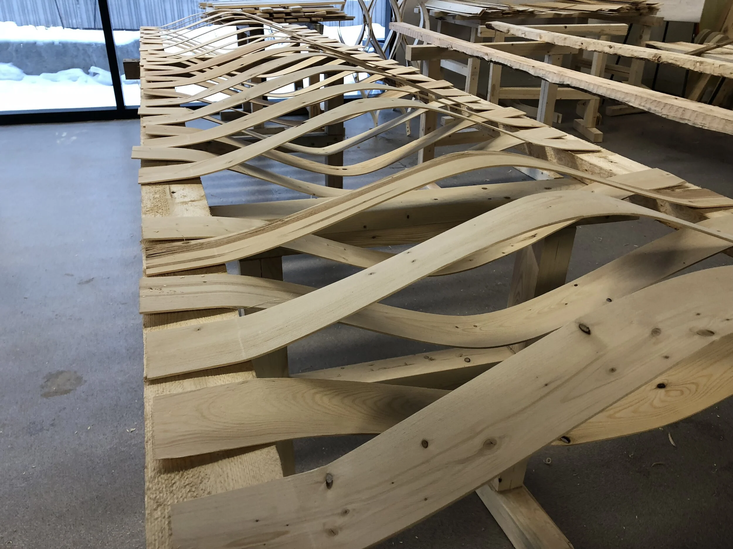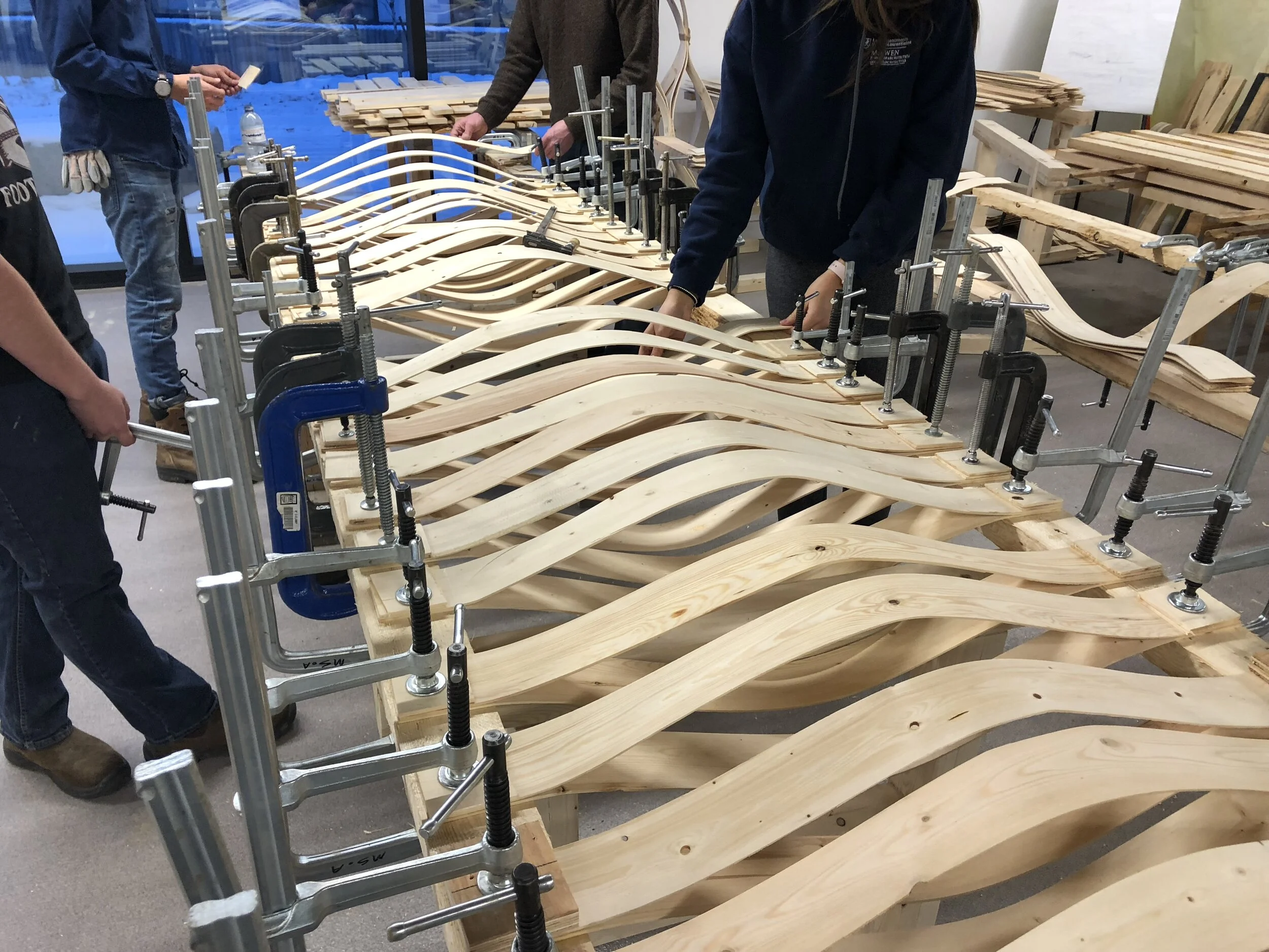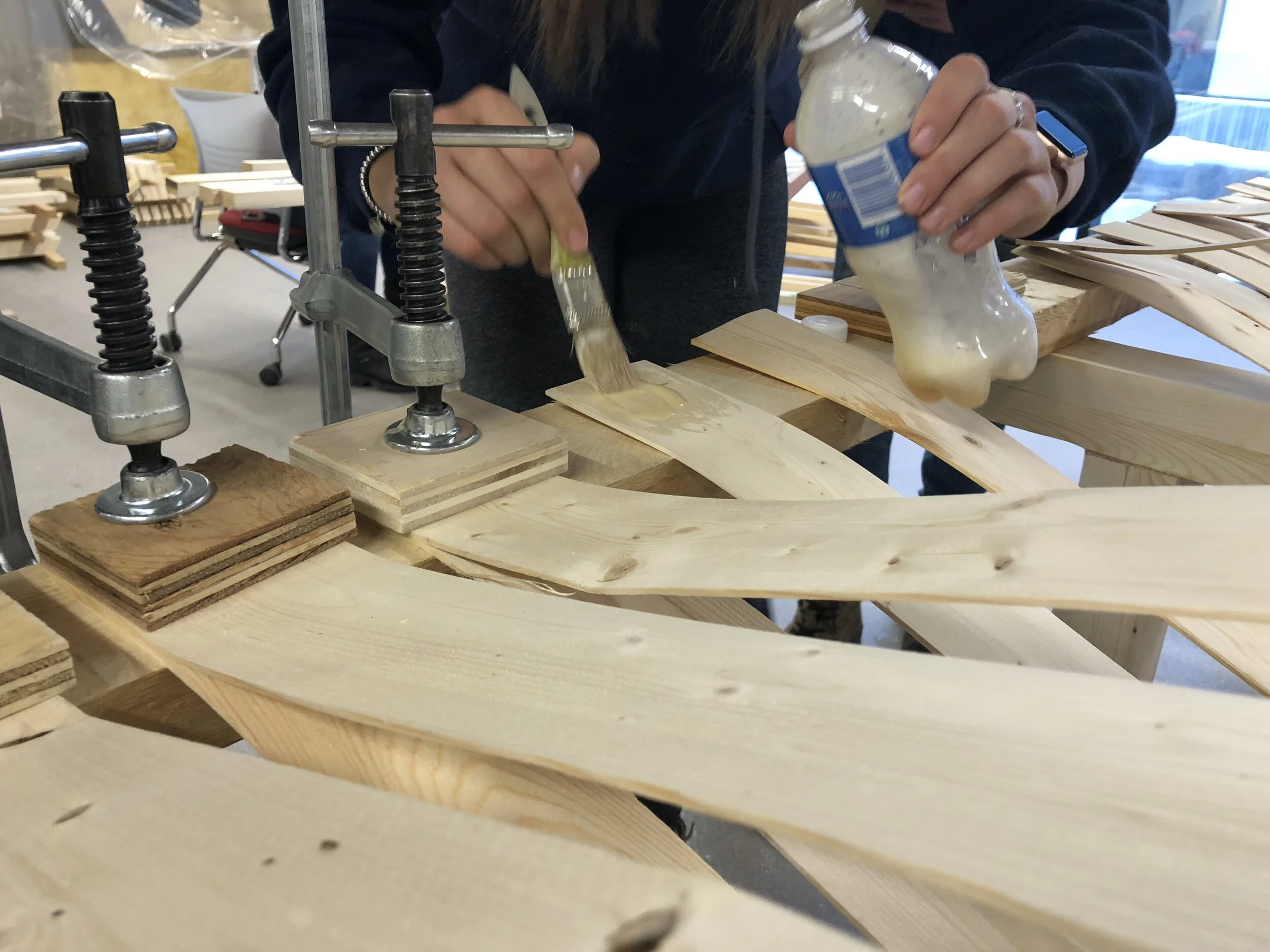 Unit 238 is assembled from two separate walls and it is completely biodegradable there are no mechanical fasteners, instead, we used a natural casein glue which we made from milk protein and jute twine to fasten all the units together. Each Unit was made from strips of pine that we had cut down and then they were steamed, after the steaming process we placed each strip in a form to create the bend. After they dried in the forms we began to assemble each unit.